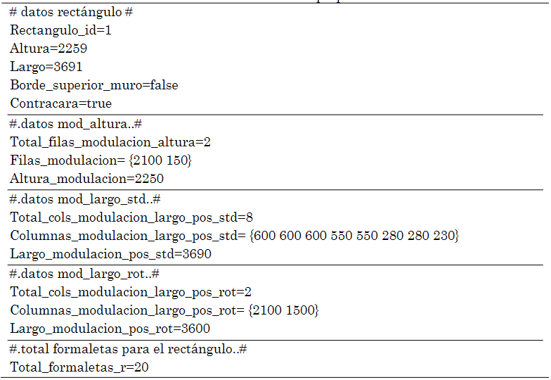 En el ejemplo de la Tabla 1. se tiene un rectángulo con contracara que requiere 20 formaletas (10 por cara) organizados en dos filas. Para formar la fila inferior se necesitan seis formaletas de 2100x600, cuatro de 2100x550, cuatro de 2100x280 y dos de 2100x230. Para la fila superior se requieren dos formaletas de 2100x150 y dos de 1500x150. El rectángulo no queda cubierto en su totalidad y, por lo tanto, se deben usar elementos no estándar para cubrir toda el área faltante. Todas las medidas están dadas en milímetros.