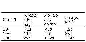 Como es de esperarse, el aumento en la cantidad de rectángulos de entrada impacta directamente el tiempo de modulación. También se puede observar que la modulación a lo ancho toma casi el doble de tiempo que la modulación a lo largo. Esto se debe principalmente a que la cantidad de anchos de formaletas y fillers de ajuste (17 para formaletas y 3 para fillers) es mayor que la cantidad de largos (7 en total) y, por lo tanto, generan espacios combinatorios distintos para la búsqueda de soluciones.