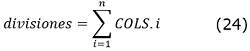 Restricción A1: cantidad de divisiones. Sea 𝐶𝑂𝐿𝑆 una lista de enteros mayores o iguales que cero tal que 𝑐𝑎𝑟𝑑(𝐶𝑂𝐿𝑆) = 𝑐𝑎𝑟𝑑(𝐹𝑎𝑛𝑐ℎ𝑜𝑠) = 𝑛, donde cada valor 𝐶𝑂𝐿𝑆𝐶𝑂𝐿𝑆.𝑖 representa la cantidad de anchos de formaletas 𝐹𝑎𝑛𝑐ℎ𝑜𝑠.𝑖 i que forman la modulación para una fila. Se introducen las restricciones (22) a (26):