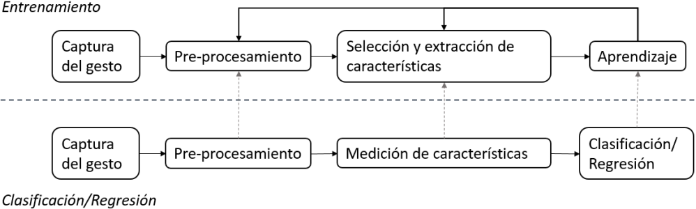 Así mismo, exige afrontar nuevos desafíos que se encuentran en todas las etapas del proceso de reconocimiento de gestos, en este texto, comprendido en dos grandes etapas: entrenamiento y clasificación/regresión (Fig. 2)