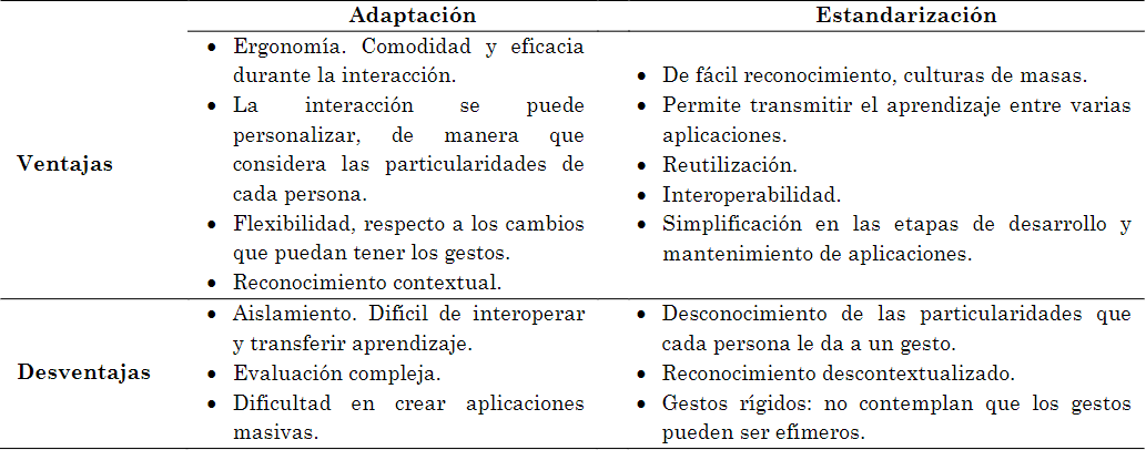 La Tabla 2 presenta una comparación de los dos enfoques, en cuanto a ventajas y desventajas. En ambos casos, la comprensión del gesto es muy amplia y aplica para diferentes partes del cuerpo: estos faciales [