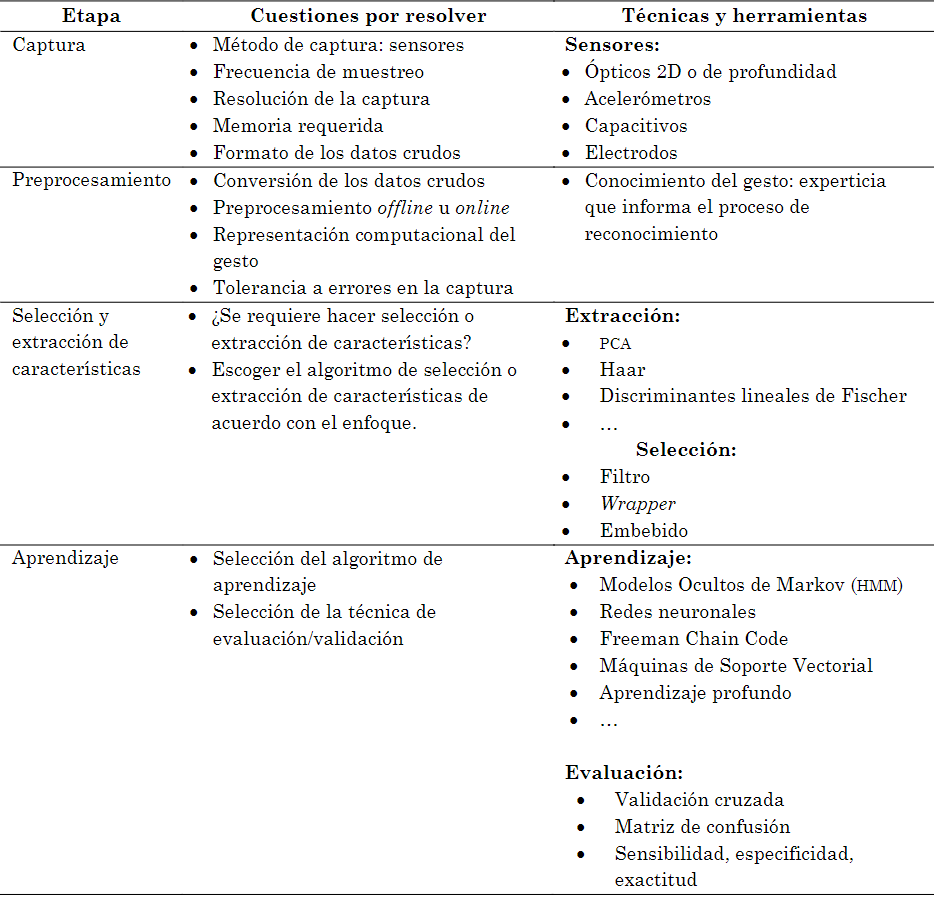 En los dos casos, el proceso de entrenamiento ocurre en cuatro etapas, resumidas en la Tabla 3: captura, pre-procesamiento, selección y extracción de características y aprendizaje. La captura de gestos se suele hacer con diferentes tipos de sensores, entre los que se encuentran: ópticos (cámaras como la PlayStation Eye y cámaras de profundidad como Kinect o LeapMotion) [