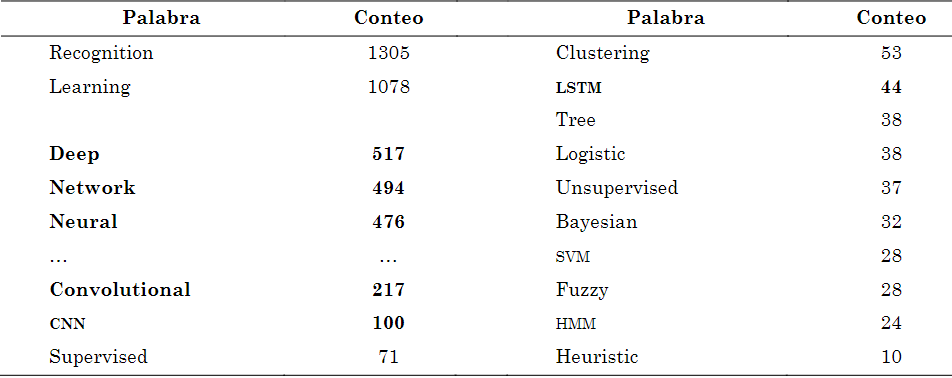 Adicionalmente, se encontró también la existencia de palabras frecuentes como clustering y unsupervised, asociadas a técnicas no supervisadas; o tree y fuzzy, asociadas a árboles de decisión y lógica difusa como técnicas no estadísticas.