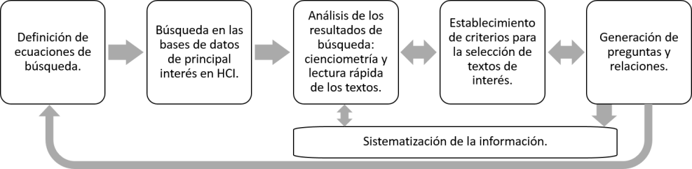 Con esta información como insumo, se seleccionaron los sinónimos y otros términos relacionados. Después de definidas las ecuaciones de búsqueda, se eligieron las bases de datos para la revisión de artículos, para lo cual se utilizó como fuente las páginas web de Special Interest Group on Computer-Human Interaction (SIGCHI) [