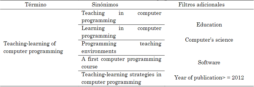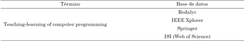 Cabe anotar que la búsqueda planteada se llevó a cabo desde el año 2012, debido a la calidad de los aportes académicos y científicos reportados en los bancos de datos validados por esta misma comunidad, que actualmente son considerados como elementos primordiales en el campo de la enseñanza/aprendizaje de los fundamentos de programación.