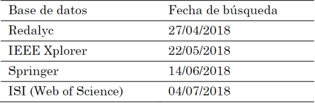 Debido a que en esta revisión sistemática se utilizaron cuatro bases de datos con sus sinónimos y filtros —en cada una de las cuales se aplicaron tres fases—, fue necesario hacer la consulta en diversas fechas como se observa en la Tabla 5.