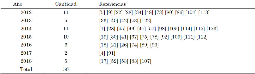 En la Tabla 7 se presentan las referencias de los 50 artículos estudios contemplados en esta revisión sistemática ordenados por su año de publicación.