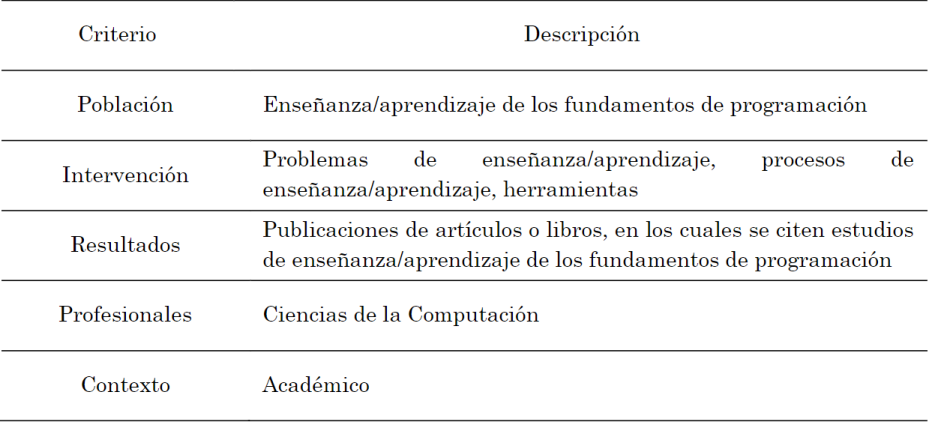 El criterio de inclusión definido es: documento científico relacionado con estudios de procesos de enseñanza aprendizaje de los fundamentos de programación para estudiantes de carreras universitarias o sus sinónimos de búsqueda. De la misma manera, los criterios de exclusión definidos son: estudios que no tengan su correspondiente cita bibliográfica, el documento no contiene los términos o sinónimos de búsqueda, solo experiencias con primeros cursos de programación de computadores y los documentos no están disponibles para descarga.