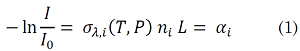 where I0 and I are, respectively, the intensity of the radiation before and after the interaction of the laser beam with the medium; σλ,i is the absorption cross-section of species i that depends on the temperature and pressure; ni, the concentration of species i; and L, the path length. ai is known as absorbance and, as (1) states, for a constant temperature, pressure, and path length, the absorbance should be proportional to the concentration of species i.The previous statement has one condition: it assumes that, for the catalytic cracking of one species (as is the case in this study), any interference of the products at the specific wavelength of the experiments is negligible. The results of Lopez-Zamora et al. [