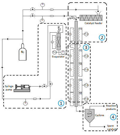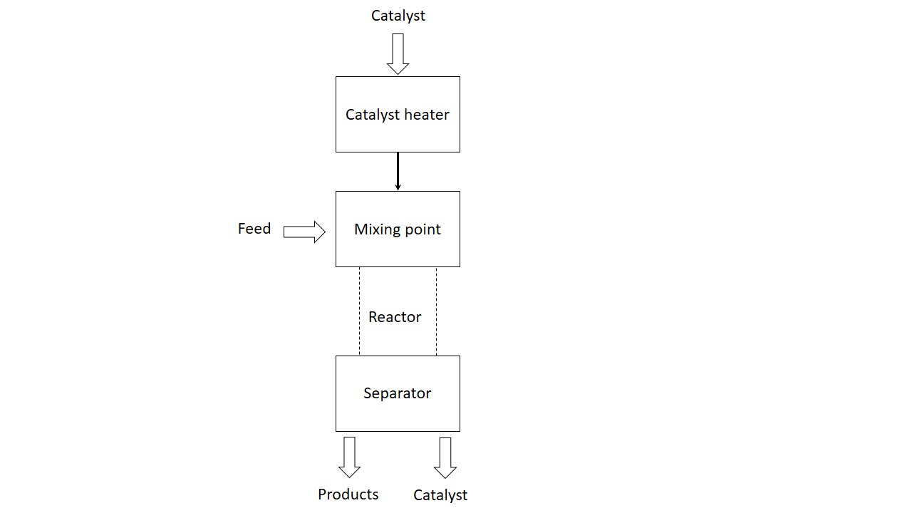 Fig. 1 presents a simplified process flow diagram of an experimental downer setup. In it, a heater increases the catalyst temperature before it comes into contact with the feed at the upper part of the reactor. The temperature in the catalyst heater is set in such a way that the catalyst stream heats the feed to a previously defined reaction temperature; the reaction continues while both phases are flowing downwards. Finally, products and spent catalyst are separated.