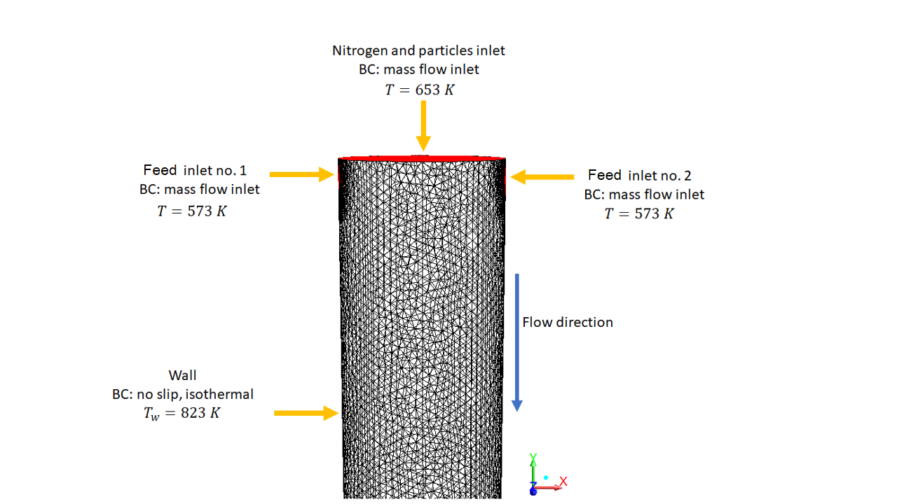 The inlet of the nitrogen and particles coming from the heating zone to the reaction zone was represented as a Mass flow inlet BC entering at the exit temperature obtained in the simulation of the heating zone.