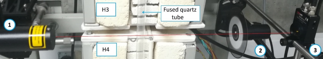 This is the Reaction zone, No. 3 in Fig. 3. Four additional tube furnaces with different lengths (0.30 m, 0.25 m, 0.20 m, and 0.20 m), individual temperature controls, and that can be moved in the vertical position to allow optical access keep the Reaction zone at a maximum reaction temperature of 823 K. The temperature control used type K thermocouples located 5 mm away from the exterior of the quartz tube.