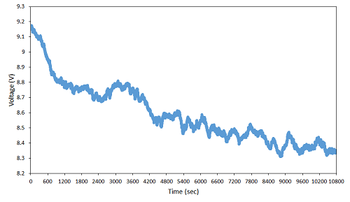 Fig. 6 presents evidence of the laser power drift when the distance between the laser and the photodetector was 5 cm and only the optical chopper was between them. After two hours of laser operation (7200 s), the fluctuations in laser intensity decreased over time but were still very intense; furthermore, there was no clear pattern. The results in Figure 6 were observed in different opportunities and could not be related to any other variable in the lab or the experiment.