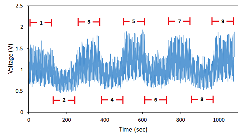 The uneven numbers (1, 3, 5, 7, and 9), i.e., zones with higher voltage, indicate periods of time when only nitrogen and catalyst were flowing. Even numbers (2, 4, 6, and 8) represent periods of time when the feed (1-hexene) was injected and N2 injection stopped, always in the presence of particles. While the high-frequency peaks and valleys in the signal were caused by the detection of particles passing through the laser signal, the average signal between each section also changed because of the laser drift. As some disruption can be expected when the flow is switched from N2 to the feed and vice-versa, the following procedure was applied to obtain an average laser signal in each zone. The time at which the highest value of intensity during N2 Injection i takes place was determined.