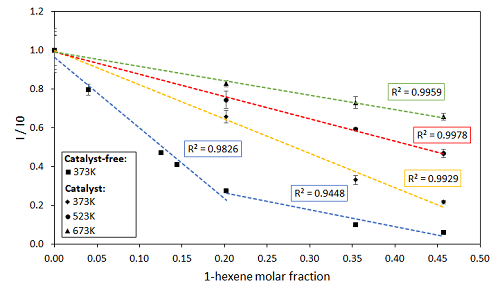 In turn, a linear trend was obtained when the variation of I/I0 with the molar fraction of 1-hexene was evaluated at the same temperature (373 K) but in the presence of an equilibrated catalyst. The error bars of catalyst-laden experiments are larger than those of the catalyst-free trials, as one would expect given the random noise that the particle flow causes.