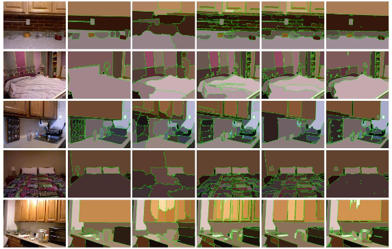 A hierarchical and iterative merging allow us to efficiently integrate such primitives and obtain a relatively coherent scene grouping. As shown in the previous results, the use of depth primitives is a clear advantage to face the challenging problem of image segmentation.
