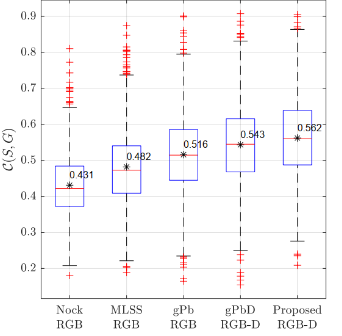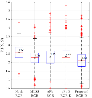 Finally, Fig. 9 reports the results of the metric Variation of Information. In it, the proposed approach achieves the lowest score, with an average of 2.13, while gPbD reached 2.36 with larger score variance (see Fig. 9). Regarding color-based strategies, MLSS achieved the best performance. In general, the proposed segmentations achieve competitive results with respect to the widely known gPbD scheme, which also involves depth information but with more complex joint definitions and relationships of data primitives. In contrast, this study is focused on the computation of simple yet robust primitives from image and depth channels, treated and coded independently.