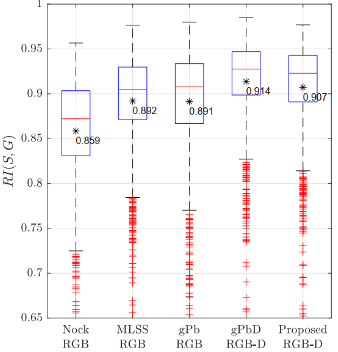 The best performance was also achieved with both depth-aware strategies, with even more compact results regarding quartile score distribution. The proposed segmentation results are competitive thanks to the coding of plane and 3D-edge features, but numerous mistakes are produced by the incorrect labeling of tiny scene objects that share the same plane or have negligible edge discontinuities. In turn, the color-based strategies exhibited a lower performance, except for the gPb approach (∼ 0.89), but with a larger variance in the results. The MLSS approach, in contrast, achieves a more compact RI variance with an average accuracy of 0.892, exceeding the gPb average but with the drawback of requiring the number of desired segmented regions.