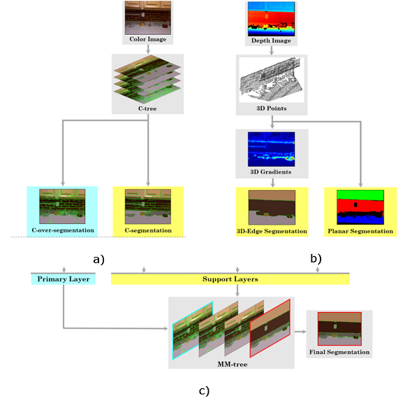 The general pipeline we propose is illustrated in Fig. 2. In it, part subfigure (a) shows the color-based tree representation (C-tree) that was implemented to manage different granularity scales from color space. From this C-tree, a first over-segmented map (C-over-segmentation) was generated as basis map for the region merging, that is, a primary layer. A more compact appearance segmentation was also obtained as support layer (C-segmentation) for further fusion support of the color space. Regarding depth information, Fig. 2 b) presents the main steps to generate the geometrical depth maps. Here, conventional pre-processing steps were followed to align color and depth data and generate 3D point clouds [