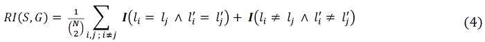 Let us consider two segmentations S and G of N pixels {x1,x2,…,xN } that assign labels {li} and {l’i} respectively, to a pixel xi. The Rand Index RI can be computed as the ratio of the number of pixel pairs having the same label relationship in S and G. [