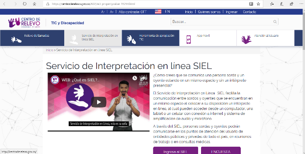 Para solventar esta problemática, el Ministerio de Tecnologías de la Información y las Comunicaciones de Colombia (MinTIC) ha desarrollado en los últimos años el Servicio de Intérprete En Línea (SIEL), al cual se accede a través del portal web Centro de Relevo como se observa en la (Fig. 2) [