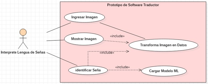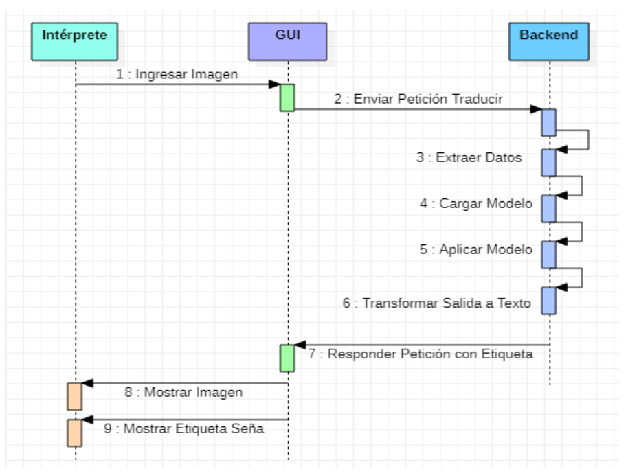 En (Fig. 38) se define como actor al usuario que usará el prototipo de software, en este caso la persona intérprete de lengua de señas. El actor carga una imagen que contenga a una persona haciendo un gesto de las 22 señas establecidas. Luego ejecutara la orden para que el sistema sea capaz de mostrar la imagen cargada junto con una etiqueta que indica explícitamente cuál es de las 22 señas. Al finalizar la tarea, la persona intérprete regresa a la página de inicio para comenzar de nuevo.