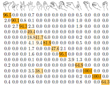 Los resultados del experimento muestran en (Fig. 12) una matriz de confusión con porcentajes de aciertos muy altos para la mayoría de las señas [
