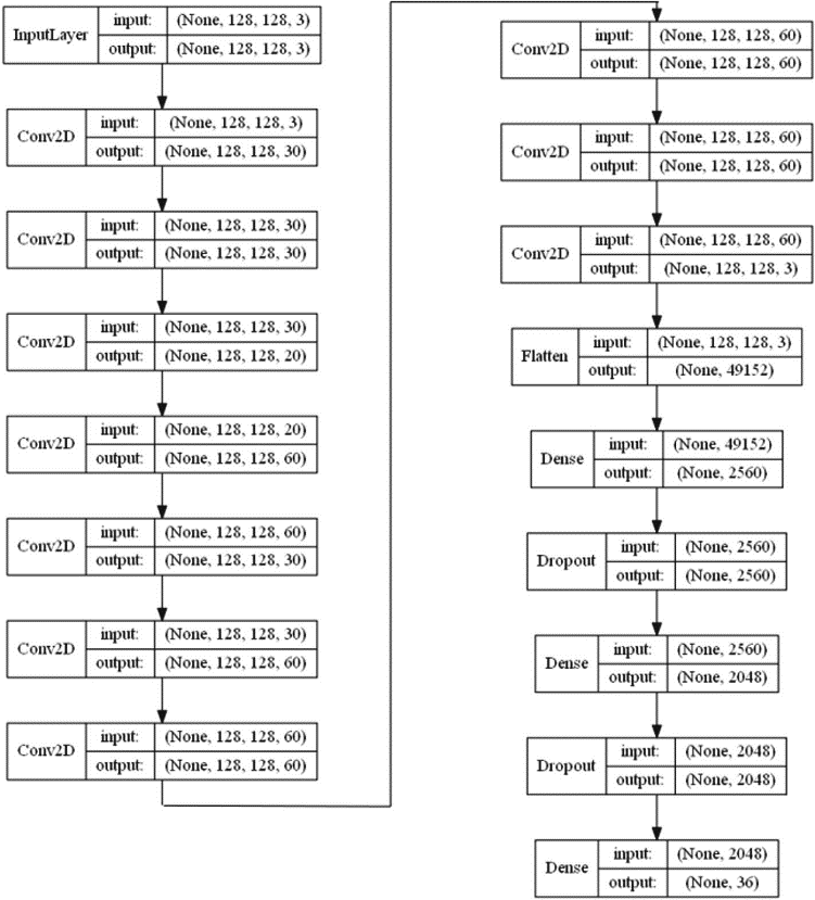 La arquitectura del sistema construido constó de 10 capas de convolución con función de activación Relu, un Kernel de 3x3, capas de Dropout con valores entre 25 y 50 % para evitar Overfitting y una capa final con función de activación Softmax (tasa de Learning Rate se deja con valor de 0.001 con un optimizador Adam) (Fig. 18).