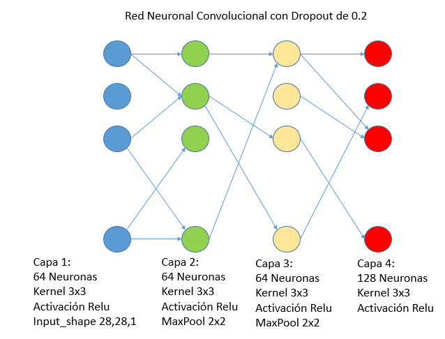 Por fortuna, la sencillez del modelo a usar permitió variar el número de neuronas existentes en las capas convolucionales junto con sus funciones de activación correspondientes. Para encontrar los parámetros óptimos se usó la técnica Grid Search, donde se variaron estos parámetros dentro un rango establecido y se combinaron los mismos. La arquitectura y funcionamiento básico de la red neuronal a implementar se describen a continuación.