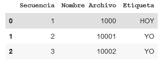 A su vez, en un archivo de Excel cada nombre de archivo de imagen es asignado con una etiqueta de su correspondiente significado o expresión de seña, en el mismo orden en que la matriz tiene guardada la imagen. Con la librería Pandas de Python, se cargó este archivo de Excel (almacenado en formato CSV) y se visualizaron los primeros registros de la asociación del nombre de la imagen con su etiqueta como se ve en (Fig. 27).