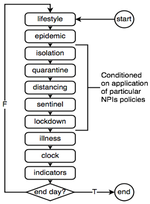 epidemic: aquí se simula la propagación de la epidemia, con transmisiones que se producen en proporción a la proximidad entre infecciosos y susceptibles y la probabilidad de contagio. Si ocurre una transmisión, el nuevo caso se caracteriza inicialmente como no confirmado, no testado, no grave y no mortal. La condición de asintomático y/o riesgoso de un nuevo caso se define de acuerdo con las probabilidades correspondientes establecidas como parámetros del modelo.