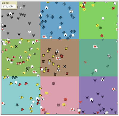 En la Fig. 3 se muestra una instantánea del área de vista de simulación. Allí los agentes se representan con diferentes formas según la zona donde residen. El color del agente representa su estado extendido (saludable: mismo color que la zona terrestre; inmune: blanco; enfermo: rojo o amarillo si es asintomático; muerto: X negra). También se pueden ver agentes especiales destinados a implementar algunos de los NPIs, como hogares para cuarentena domiciliaria y ambulancias para pruebas centinela.