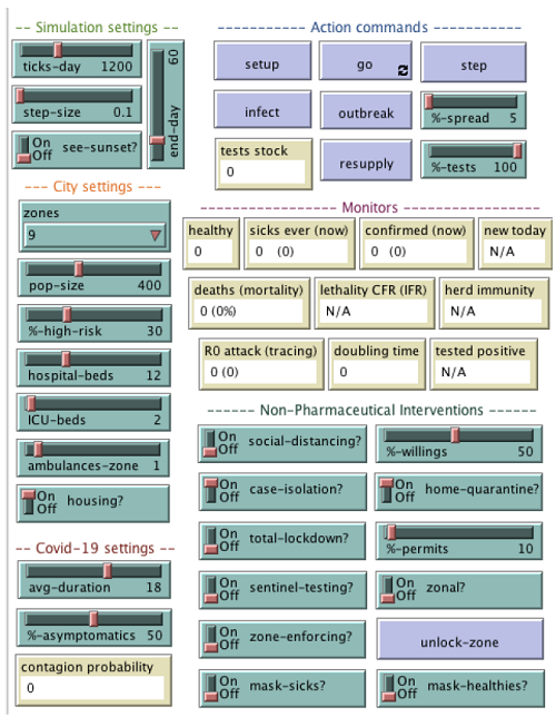 El panel de control está organizado en secciones relacionadas con la configuración general de la ciudad y de la COVID-19, monitores de indicadores epidémicos, parámetros, comandos de acción para ejecutar la simulación y una sección especial para la activación de NPI con sus parámetros correspondientes. En la Fig. 4 se muestra una instantánea del panel.