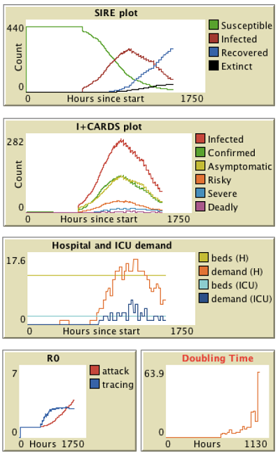 3) Por último, se obtienen una serie de gráficos que muestran la dinámica de la simulación con respecto al tiempo: gráfico SIRE (Susceptibles, Infectious, Recovered, Extinct), gráfico I+CARDS (Confirmed, Asymptomatic, Risky, Severe, Deadly), gráfico de demanda de camas de Hospital y UCIs, y gráfico de curvas de estimaciones de R0 y tiempo de duplicación.