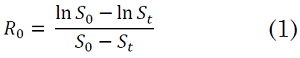donde S0 es la cantidad inicial de susceptibles en el momento de la introducción de los primeros infectados, y St la cantidad de susceptibles en el momento t. El segundo estimado se obtiene a escala individual, calculado directamente mediante rastreo a los agentes, a sus contactos y contagios individualmente a lo largo de la línea de tiempo de la epidemia, y luego tomando el promedio, como se observa en (2):