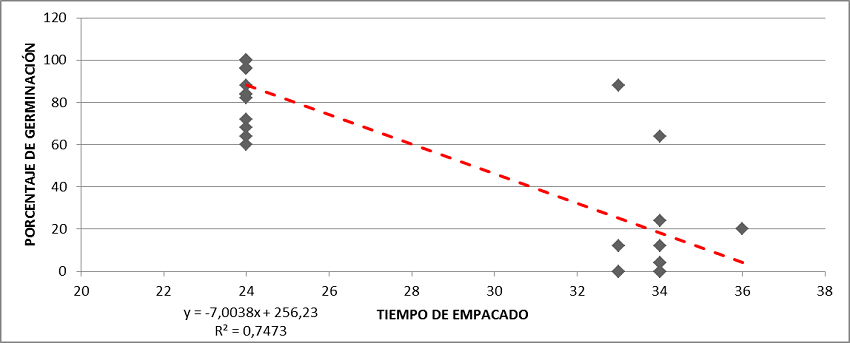Dado que el tiempo de empacado pudo influir en la calidad de las semillas y su desempeño fisiológico, lo cual se reflejó en una menor viabilidad y porcentaje de germinación, se realizó una análisis de regresión entre el tiempo de empacado y el porcentaje de germinación, encontrando una relación negativa entre el tiempo de almacenamiento y la germinación, lo que demuestra que a mayor tiempo de empacado las semillas pierden su viabilidad [