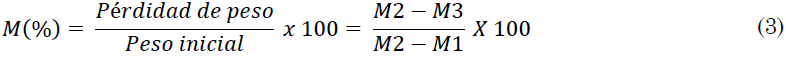 Dónde: M1 =peso (g) del contenedor y tapa; M2 = peso (g) del contenedor, la tapa y el contenido antes del secado; M3 = peso (g) del contenedor, la tapa y el contenido después del secado