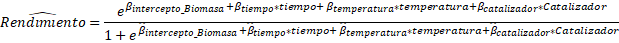 Donde: “R” es Rendimiento, “t.m” es tiempo modificado, “T” es temperatura y “B” es el tipo de biomasa.