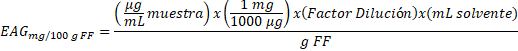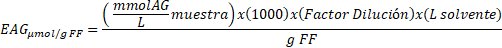 Finalmente, se expresa la concentración total de antioxidantes en equivalentes en miligramos de ácido gálico por cada cien gramos de fruto fresco (FF) (mg EAG/100 g FF) según (2) [