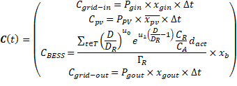 Where Py is the active power and xy is the corresponding cost for the system y, namely Grid-in: electricity tariff, PV: average cost of PV generation, BESS: total cost of the BESS system and Grid-out: Feed in Tariff for PV exports. ΓR is the rated life of BESS, D and DR are the actual and the rated Depth of Discharge (DoD) respectively. CR is the rated amp-hour capacity at rated discharge current and CA is the actual discharge ampere-hour capacity of BESS. Finally, dact is the actual ampere hour discharge.