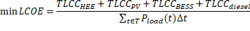 Where TLCC stands for the Total Life Cycle Cost, and it is calculated for each generator type based on the capital cost, Operation and Maintenance (O&M) costs, interest rates and lifetime of each system.