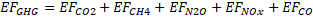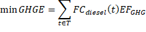 The GHGE objective depends on the fuel consumption of the diesel machine and the emission factor for each Greenhouse Gas.