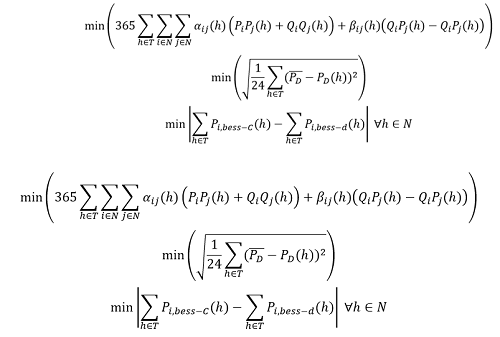 Where (P ̅ D) and PD(h) are the mean demand and the actual demand at hth hour. Pi,bess-C(h) and Pi,bess-C(h) represent the BESS charging and discharging power in the node i and hour h respectively.