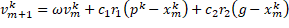 Where vkm+1 is the velocity of the particle (initialized random) at the next step, vkm is the velocity at the current step, ω is the inertial coefficient of the particle (weights particle tendency to continue his own direction), c1 is the cognitive acceleration constant (weights particle’s tendency to follow the direction of the best place it has ever found), c2 is the social acceleration constant (weights particle’s tendency to follow the direction of the best place the swarm has ever found), r1 and r2 are random real numbers between zero and one. xkm, pk and g are the actual position of the particle k, the best position found by the particle k and the best position found by the swarm respectively, g and pk positions are related to the value of the decision variables when the objective function reached best global and best particle values respectively. The position of each particle is updated after updating each particle’s velocity as in (44).