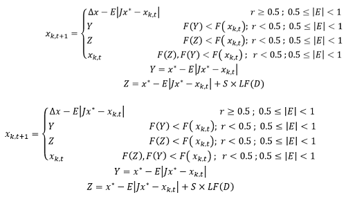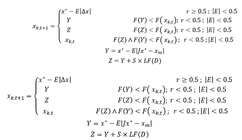 Where r1, r2, r3 and q are random numbers from zero to one. xm,t is the average position of the population and UB,LB are the maximum and minimum locations of the population, respectively. During exploitation, the energy of the prey and a random parameter . control the way the hawk attacks the prey. If r ≥ 0.5 and 0.5 ≤|E|<1, then the hawk performs a soft besiege, updating its position in direction to the difference of positions between the agent and the prey ∆x modulated by ∆x and the strength of the prey to jump and scape the attack J. If r < 0.5 and |E|≥0.5 the hawk can update its position either by soft attacking the prey (update its position based on the location of the prey, the strength J and the position of the hawk) or by attacking the prey following the Levy Flight function imitating leapfrog movements on the prey (soft besiege with progressive rapid dives). Firstly, the decision is made by evaluating the objective function of the updated solution when soft-attacking (F(xk,t+1 )) and comparing it with the objective function value of the original solution (F(xk,t)). If F(xk,t+1 ) < F(xk,t) then the updated solution is assigned for the next iteration. If the previous condition is not met, then the objective function value for the updated solution based on the Levy Flight function is now compared against the objective value of the original solution and if the condition F(xk,t+1) < F(xk,t) is met, then the updated solution is assigned for the next iteration. If neither condition is met, then the original solution is preserved. These behaviors are described in (61). The jump strength and the position difference are calculated as in (62) and (63) respectively.