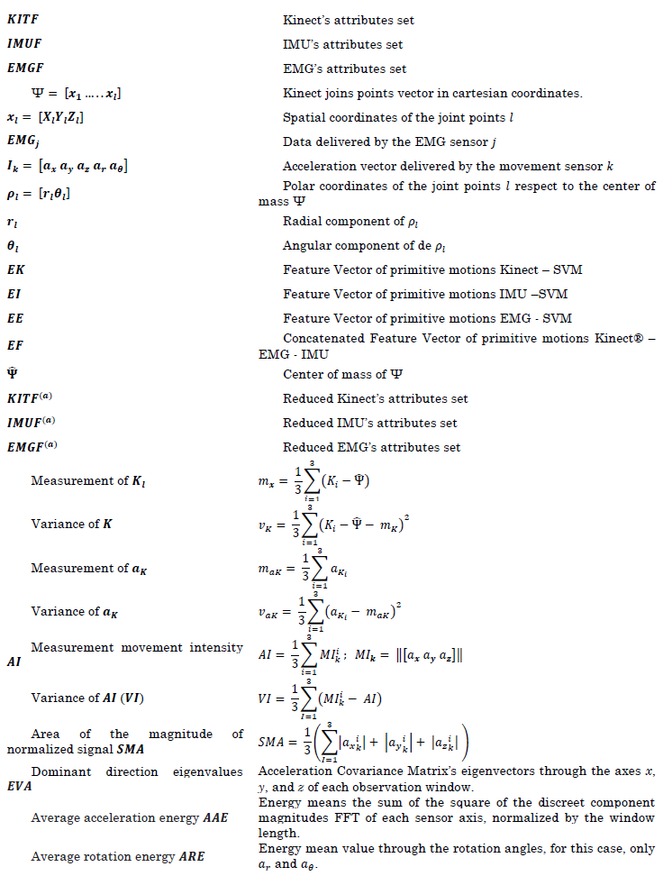 In this section, we discuss the method to process the data through the statistic descriptors to parameterize the information given by each articulated point in a feature set that replaces the information recollected by the instruments. It is essential to clarify the new data space is redundant. Therefore, a dimensionality analysis is introduced to establish the minimum feature set, stabilizing the primitive movement classifier’s performance [