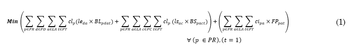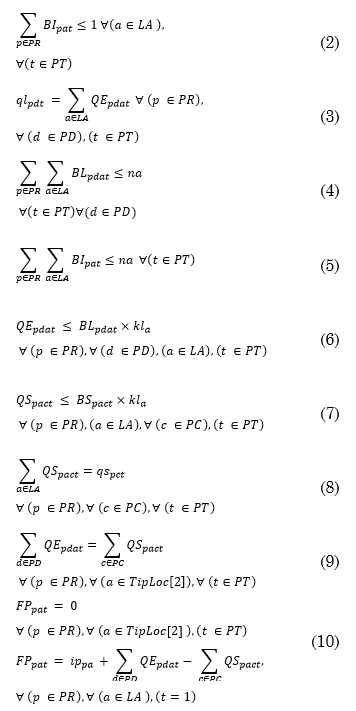 La función objetivo (1), busca minimizar los costos de trasporte clp dentro del centro Cross Docking y los costos de mantener en inventario unidades de carga de los productos cipa; (2) garantiza que un lugar de almacenamiento, en un momento de tiempo, solo puede recibir un tipo de producto; (3) garantiza que todo lo que llegue se localice; (4) garantiza que no se viole la capacidad en número de sitios de almacenamiento; (5) Garantiza que no se sobrepase la capacidad del centro de almacenamiento; (6 y 7) garantizan la relación entre binarias y las cantidades de entrada y salida de producto, y el control de la capacidad en el lugar de almacenamiento; (8) garantiza que se cumpla el requerimiento en cada puerta de salida de cada producto; (9) garantiza el balance en las localizaciones tipo dos; (10) garantiza que el inventario final en las localizaciones tipo 2 sea cero; (11 y 12) definen el inventario final de producto en cada lugar de almacenamiento y en la terminal; (13) relaciona el inventario con la binaria de inventario; (14) garantiza que no se asigne a una localización, dos productos diferentes; (15 y 16) evitan que se asigna a una localización que tiene inventario de un producto otro producto diferente; (17 y 18) definen el tipo de variables.