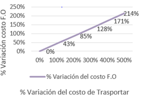 De los anteriores resultados, se puede identificar que a medida que el costo de trasporte se incrementa, se presenta un aumento en el valor de la función objetivo en una proporción menor al aumento del costo, ya que si se realiza un aumento del costo de 500 % el porcentaje de aumento de la función objetivo es de 214 % con un costo de $ 148.553,00 (ver Fig. 1).