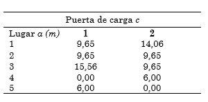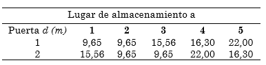 En las Tablas 2 y 3 se detallan los parámetros de las distancias leda y lsca, los cuales representan la distancia en metros desde la puerta de descarga hasta el lugar de almacenamiento y desde el lugar de almacenamiento hasta la puerta de carga respectivamente.
