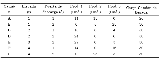 En las Tablas 4 y 5 se detallan las cantidades de cada tipo de producto que llegan en los camiones de entrada y se despachan en los camiones de salida. Tanto los camiones de entrada como los de salida tienen una capacidad de treinta (30) pallets y por lo general contienen más de 2 tipos de producto.